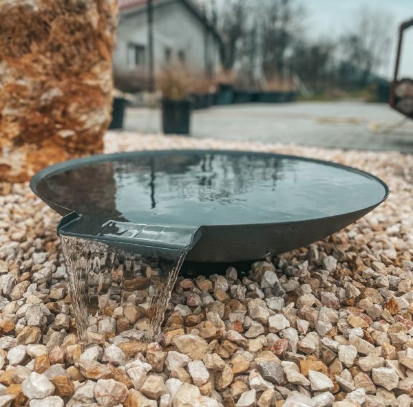Ručne vyrábaná fontána z Lakovanej ocele v tvare misy s vodopádovým žlabom v šírke 15cm.